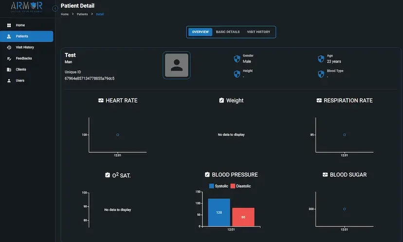 Trend Analysis: Auto-plotted graphs for BP, SPO2, HR to track progress.